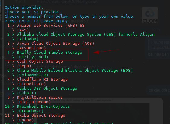 Sau đó sẽ hiện ra các nhà cung cấp 4, ta chọn “Bizfly Cloud Simple Storage”.