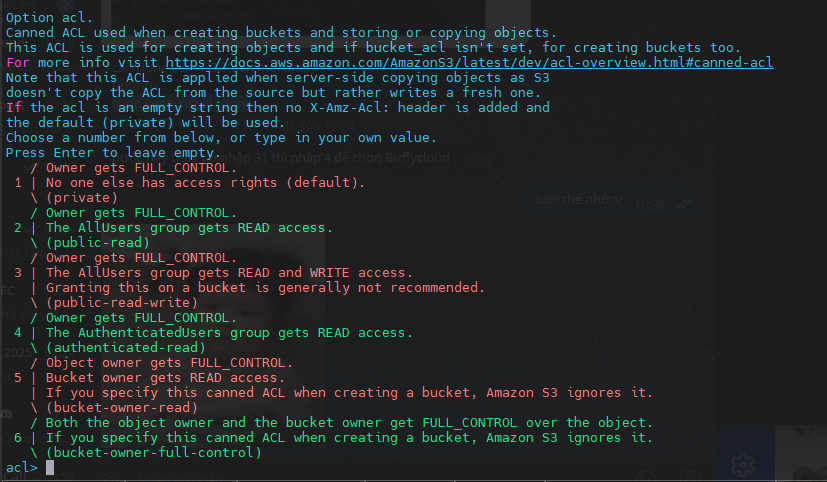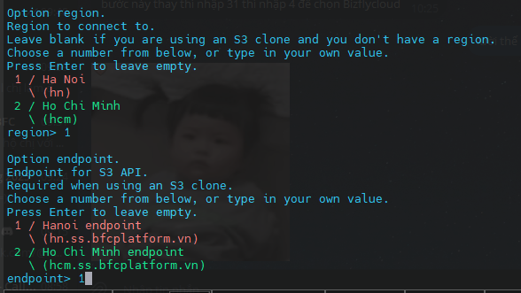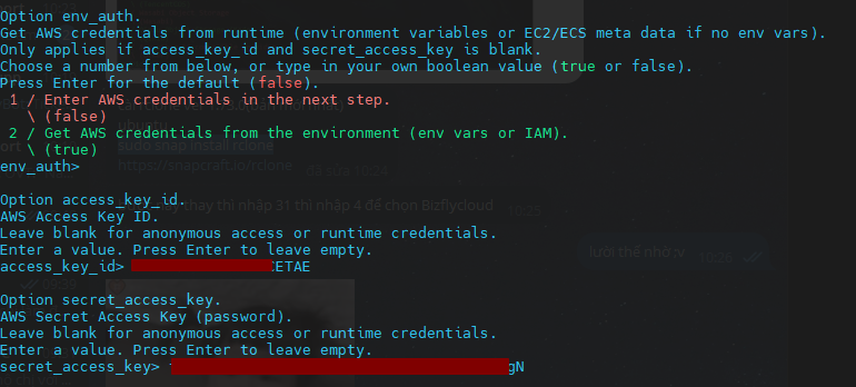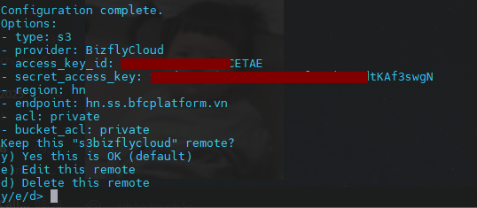 Tiếp đến ta chọn default để điền access key và private key S3 của Bizfly Cloud